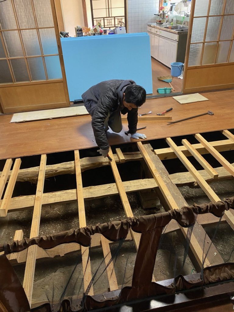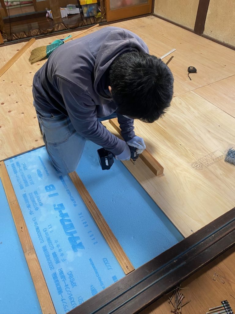 既存の床は、まだそこまで古くはなかったのですが、断熱材が入っておらず、寒い時期の底冷えがなかなかだったので、思い切って張り直しをしました。