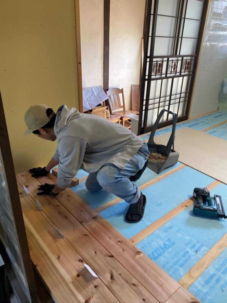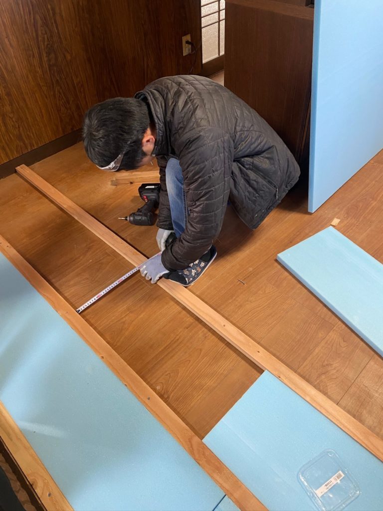 フローリング張りDIY 〜根太張り工法〜 2025年6月17日 最終更新日時 : 2025年6月17日 kurashi-seeds ダイニングキッチンの床は、既存の床の上に根太を張り、断熱材を入れて、その上にフローリング材を張る根太張り工法で作りました。 既存のキッチン部分には床材がなかったので、 前回剥がしたものを適当に張り付けました。 既存のフローリングの上に、根太と断熱材を張って行きます。 根太の上に繋ぎ目が来るように張って行きます。 隙間がある程度一定になるように、名刺をスペーサー代わりに張って行きました。 無垢のフローリングに変わるだけて、ガラッと部屋の雰囲気が変わりました。 快適な居住空間が出来上がりました♩ \ 最新情報をチェック / FacebookXBlueskyHatenaCopy