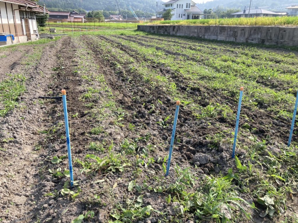 紐で目印をして、70センチの幅で大豆を植えました。