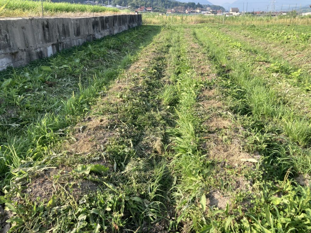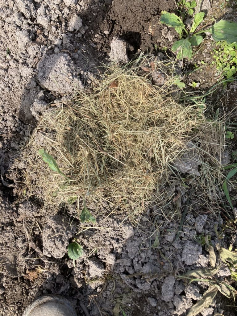 こちらは、畝に蒔いて草マルチをした状態です。