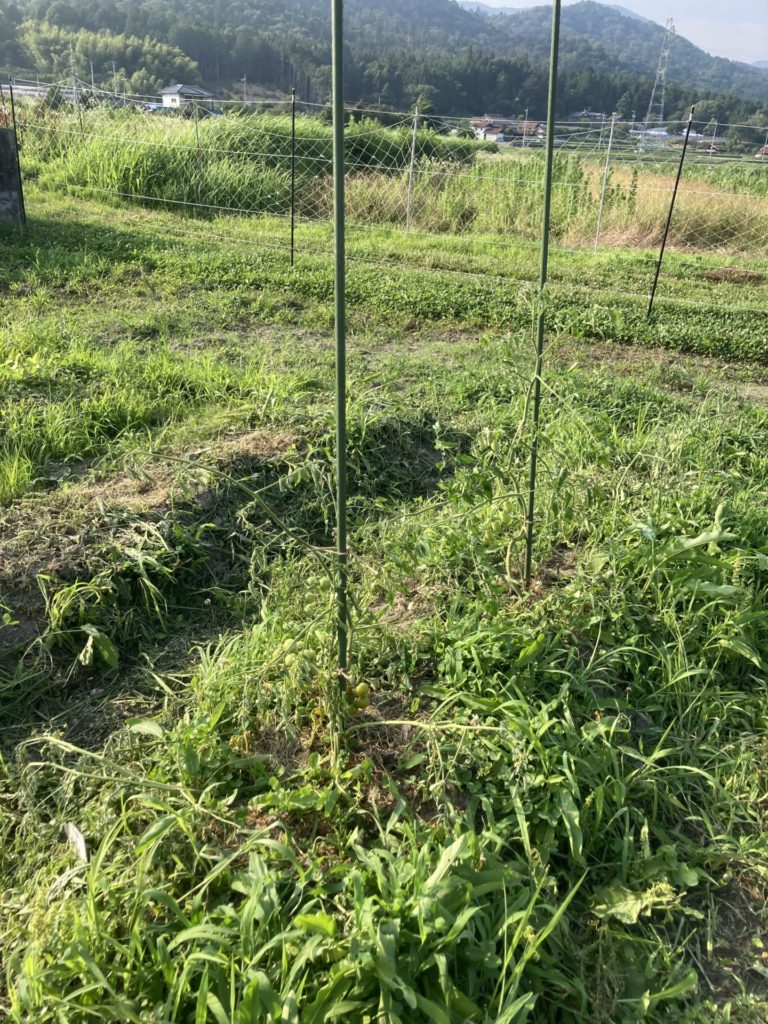ざっと下草刈りをして、まずは伸びてきたトマト、ナス、キュウリの支柱立て。