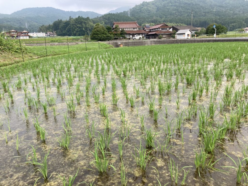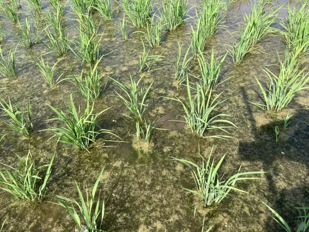 30年ほど、草刈りのみで田んぼとして使っていなかった土地なので、有機物が多いことと、ここ最近の高温のせいか、田んぼに藻が大量発生しました。