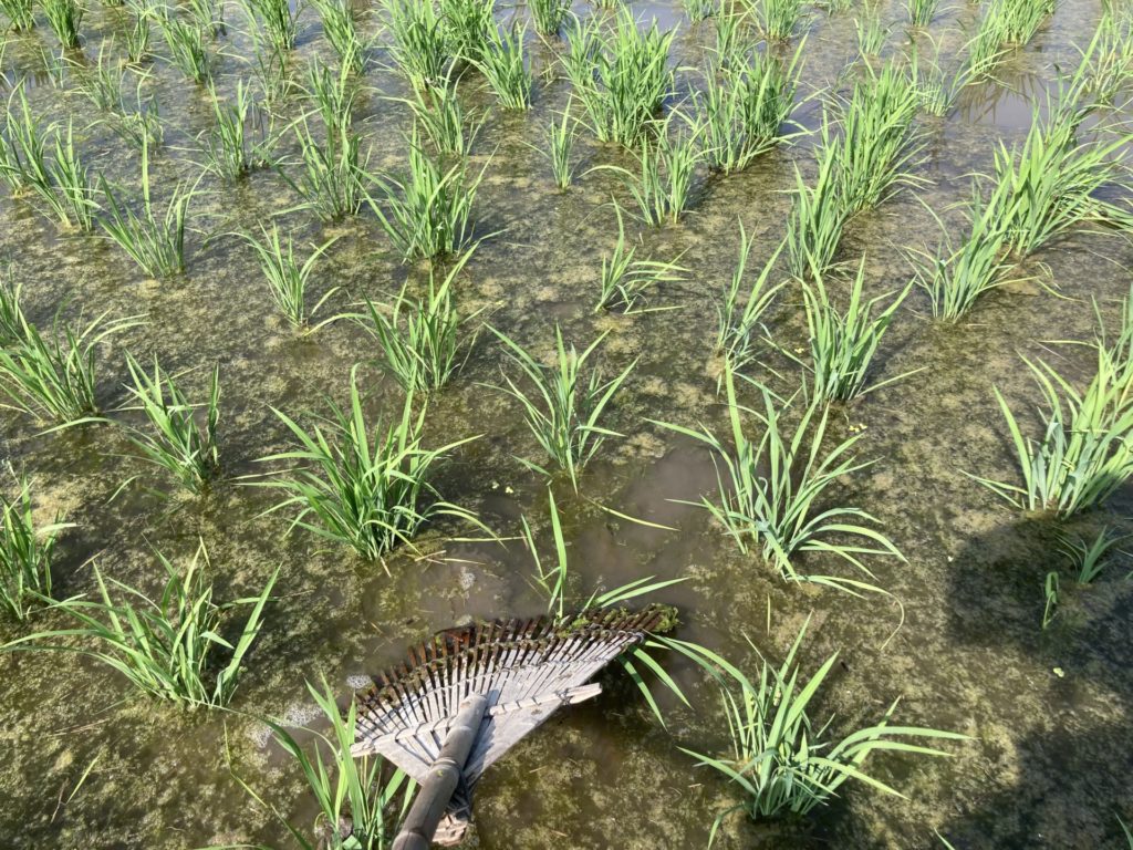 除草作業後は、どうしても藻が稲にかかってしまうので、熊手で藻を取り除き稲を起こして歩きました。