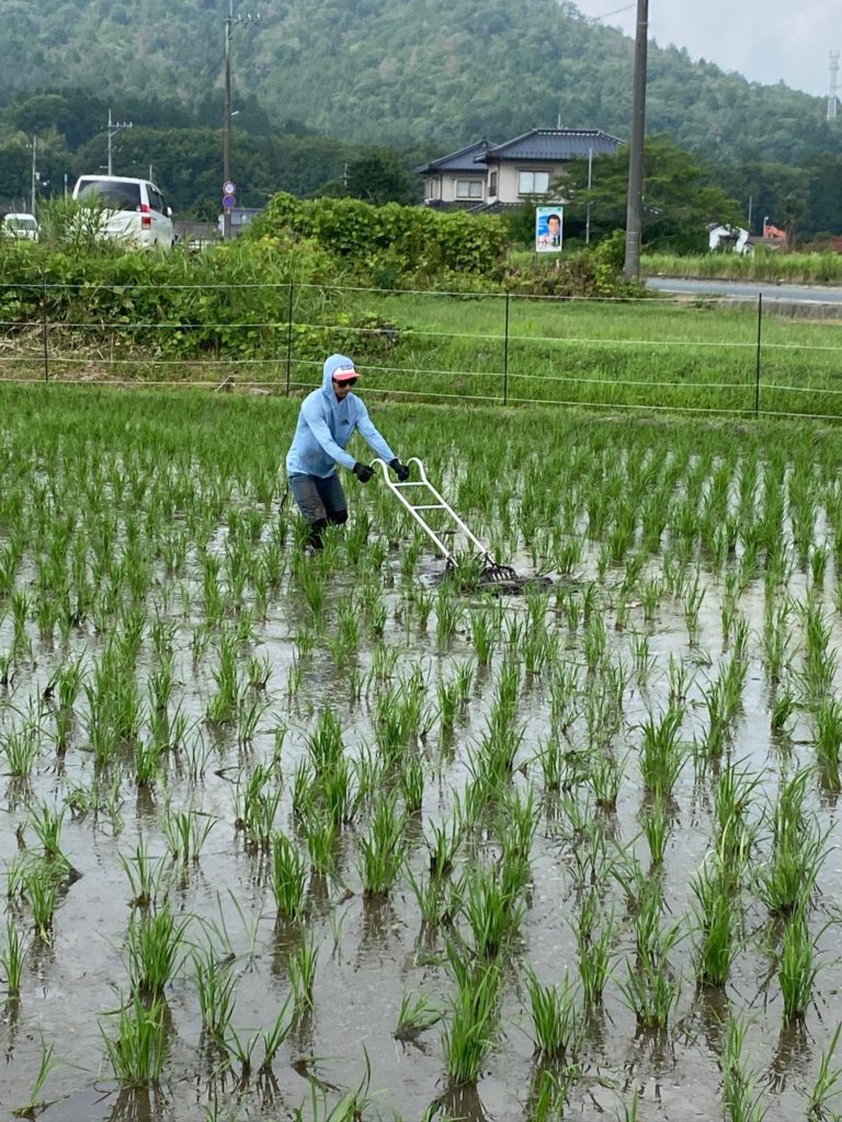 補植した部分や、水深が深く稲の育ちが遅い部分は手押しの田車がいい感じでした。