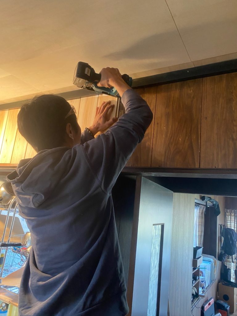 田んぼの作業がひと段落したので、キッチンの壁に杉の羽目板を張りました。