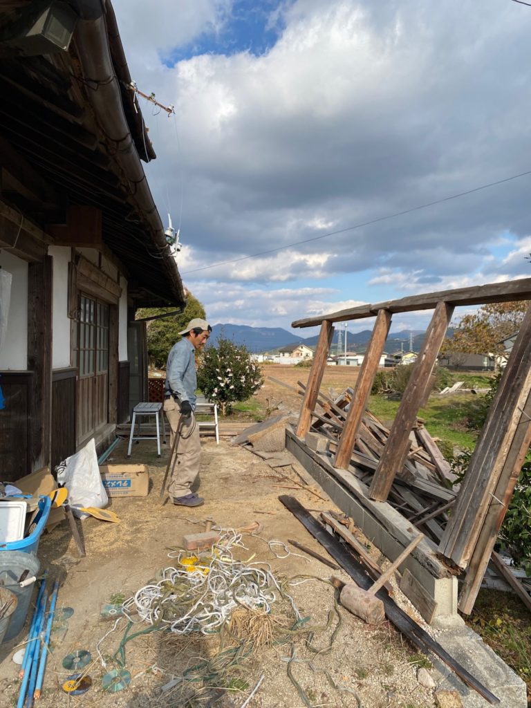 壁と屋根がなくなったら、バールとハンマーを使って解体しました。