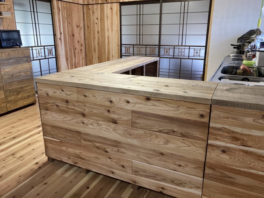 天板と棚板は、端材ではなく足場板と座板を使用しました。
