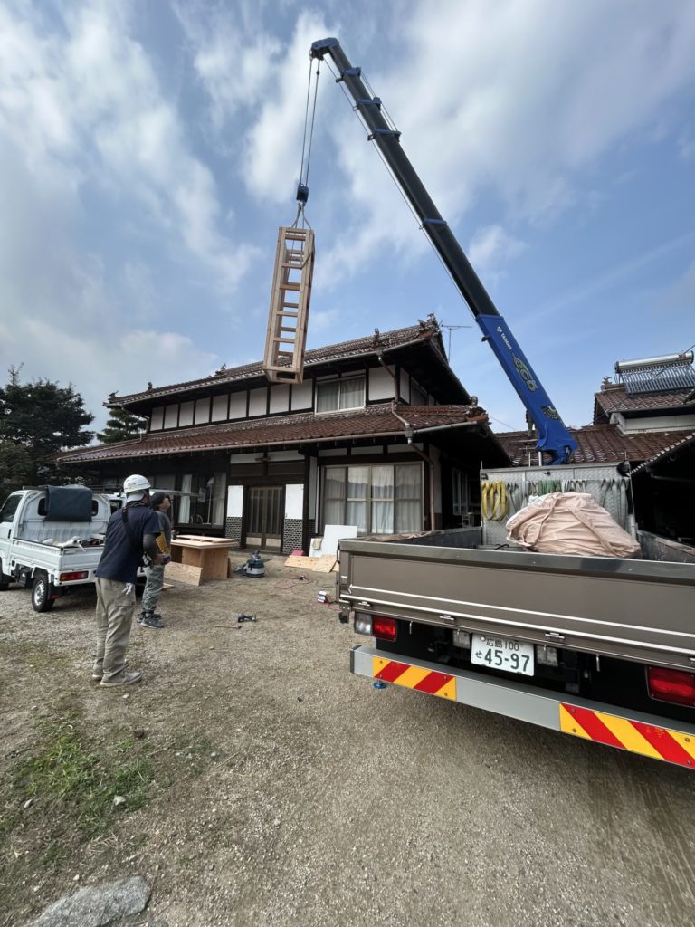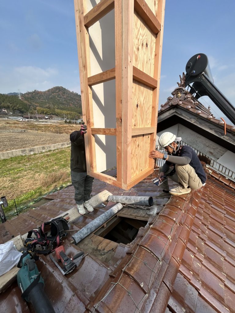 防火対策をした煙突の通り道をクレーンで吊り上げ。